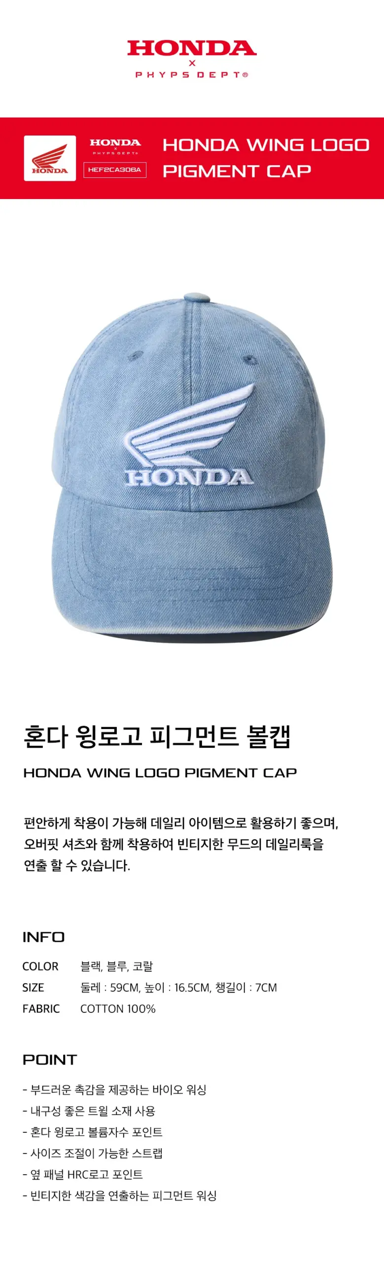 Honda Wing logo Pigment Cap HRC 淺藍色牛仔布料舊化 刺繡LOGO棒球帽